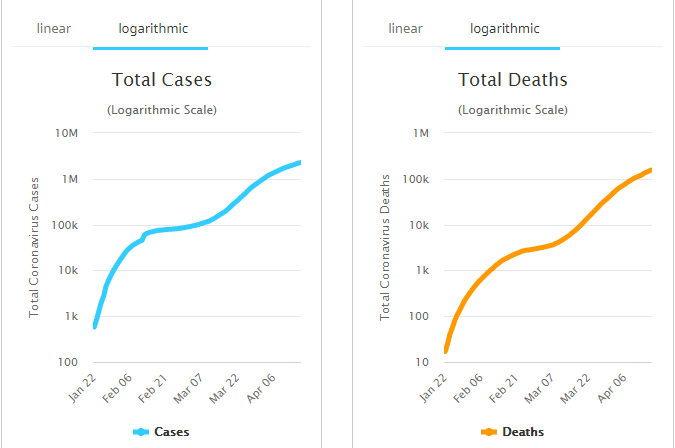 PHOTO: A logarithimic scale showing coronavirus global numbers of confirmed cases and deaths [Source/www.worldometers.info/coronavirus/]